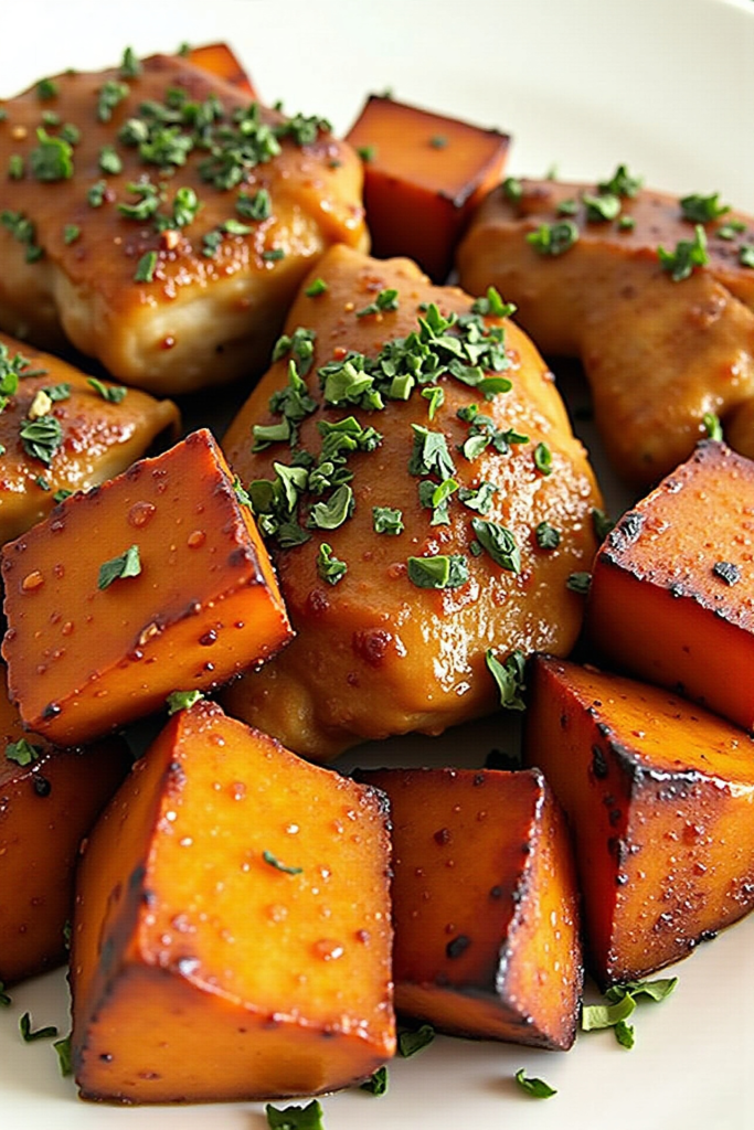 - Return to oven and roast for an additional 15–20 minutes, or until the chicken reaches 165°F (74°C) and the sweet potatoes are tender and caramelized.